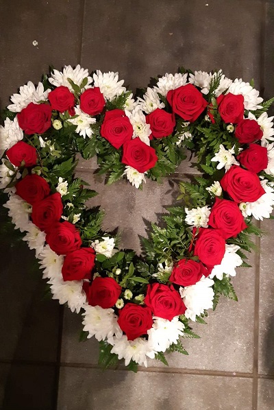ATH. BLÓMIN á myndinni eru einungis dæmi um hvaða BLÓM OG LITI má nota í útfararhjarta.