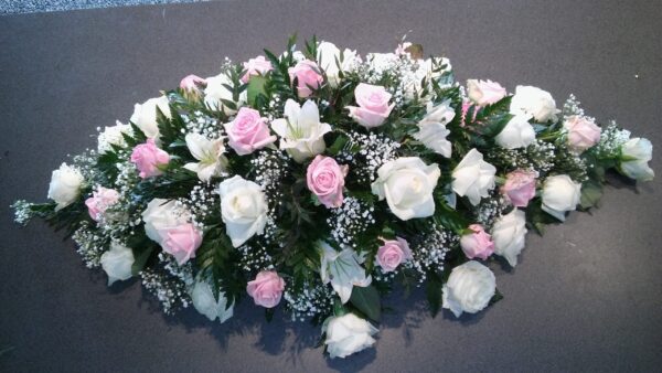 ATH. BLÓMIN á myndinni eru einungis dæmi um hvaða BLÓM OG LITI má nota í kistuskreyingu.